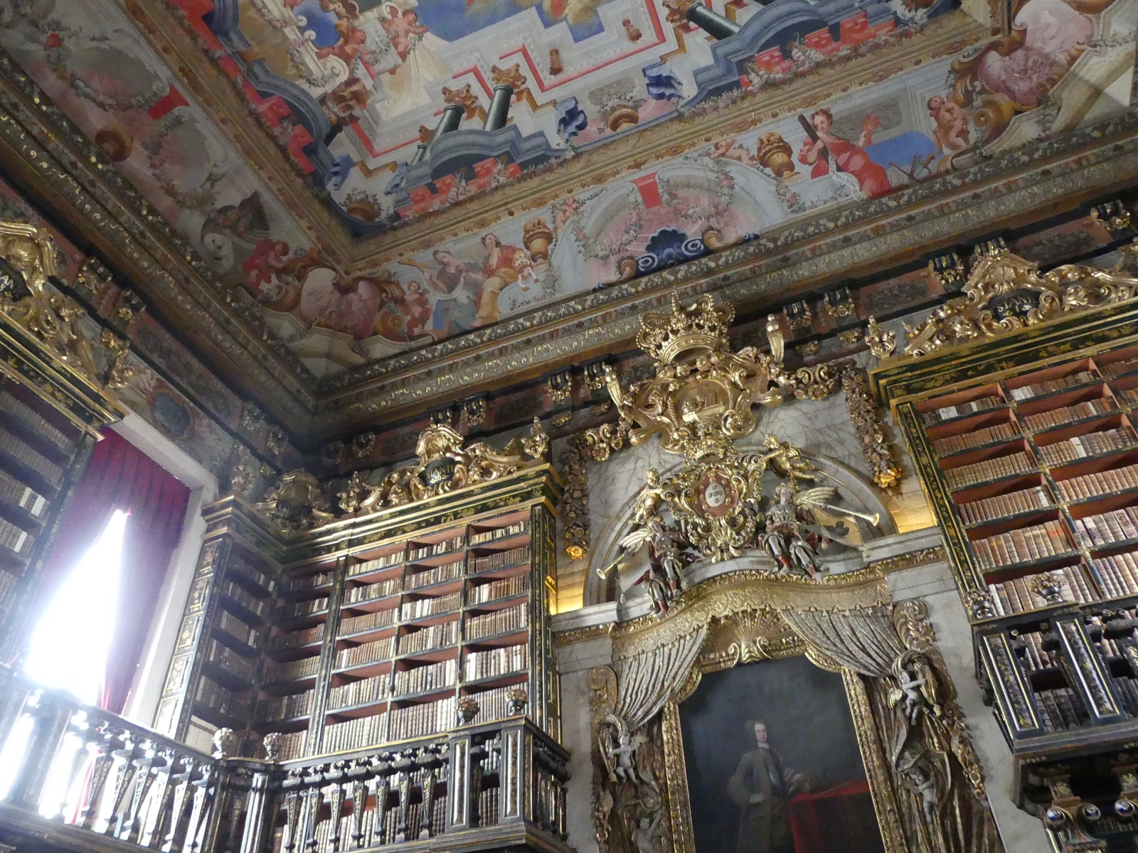 Visite de l’université, le matin.La chapelle de San Miguel avec un orgue splendide, tout en dorure. Le palais royal où se trouvent les locaux de prestige de l’université .La salle des capelas où les étudiants en fin d’étude reçoivent leurs diplômes avec de belles cérémonies (remise d’une cape et de symboles en fonction de chaque université).Visite de la bibliothèque Joanina où Guy arrive à faire quelques photos en douce malgré l’interdit.
