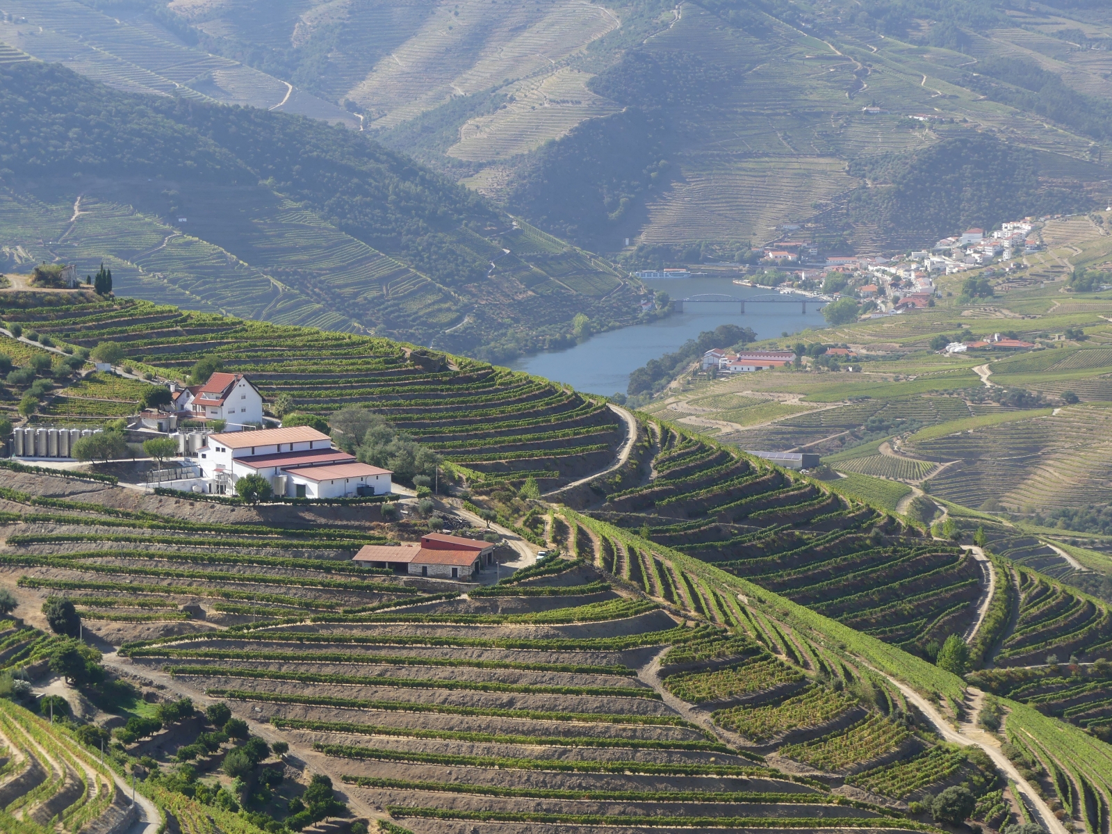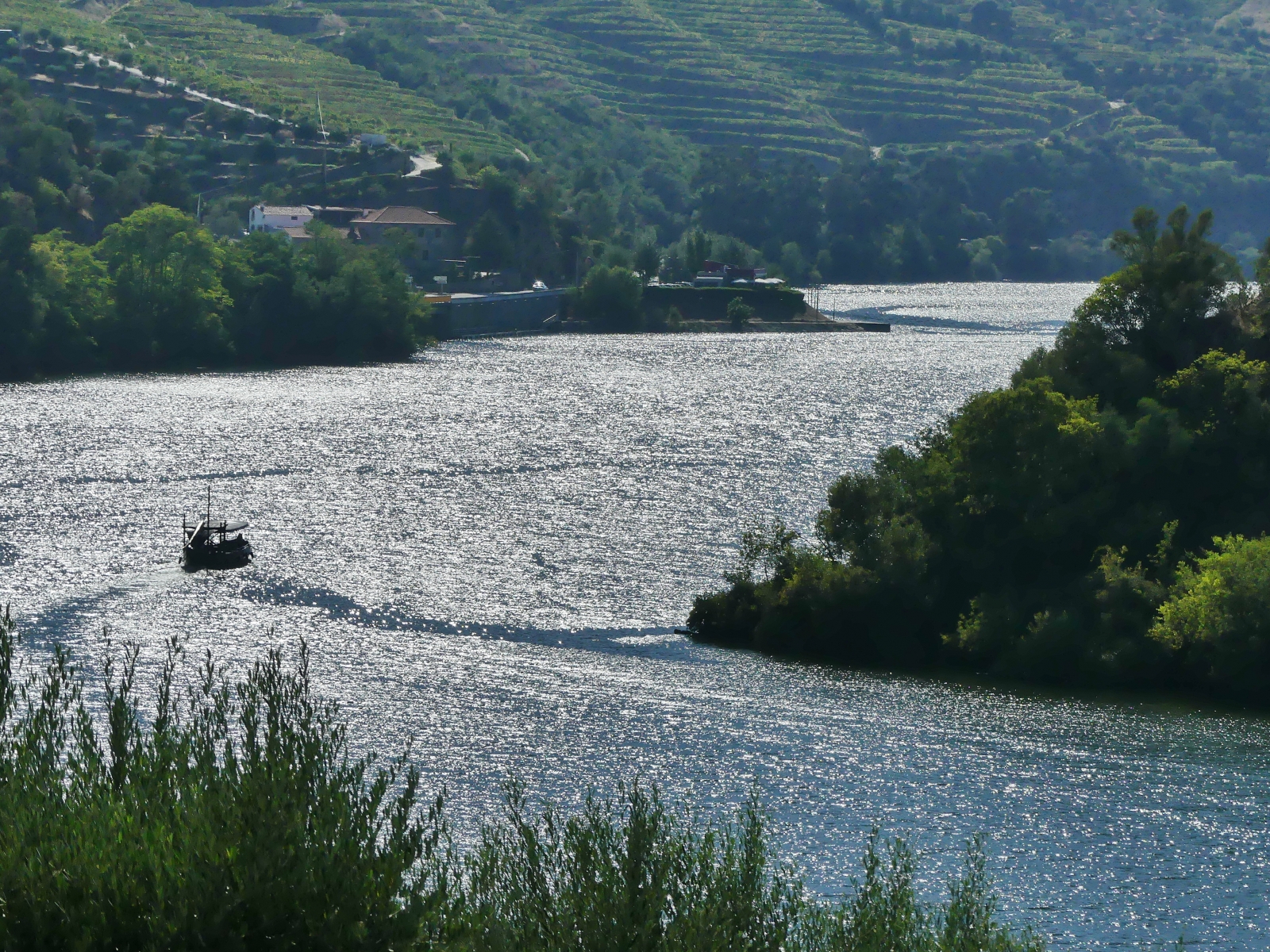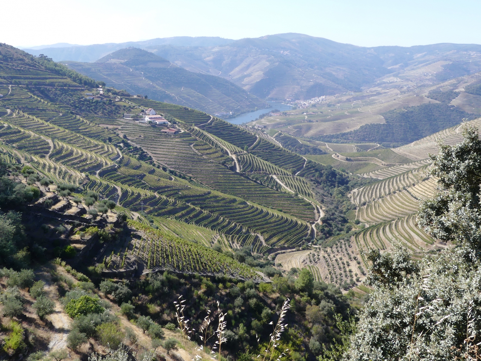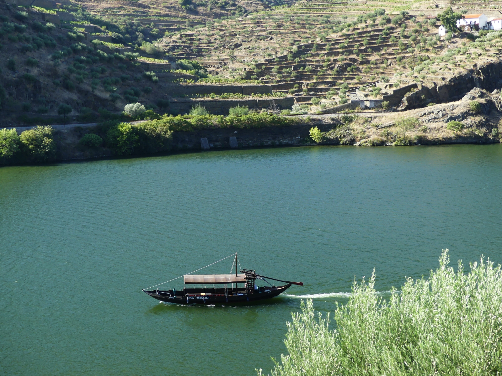 Par une petite route on traverse de très beaux paysages de vignes, de plantations d’oliviers et d’amandiers, avec des pigeonniers et de belles fermes. Plus on approche du Douro, plus cela devient grandiose: vignes en terrasses avec des formes circulaires ou mouvantes qui suivent les pentes du terrain. Le fleuve serpente au milieu des vignes avec ses beaux bateaux typiques.