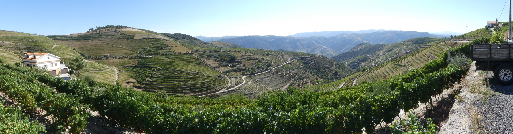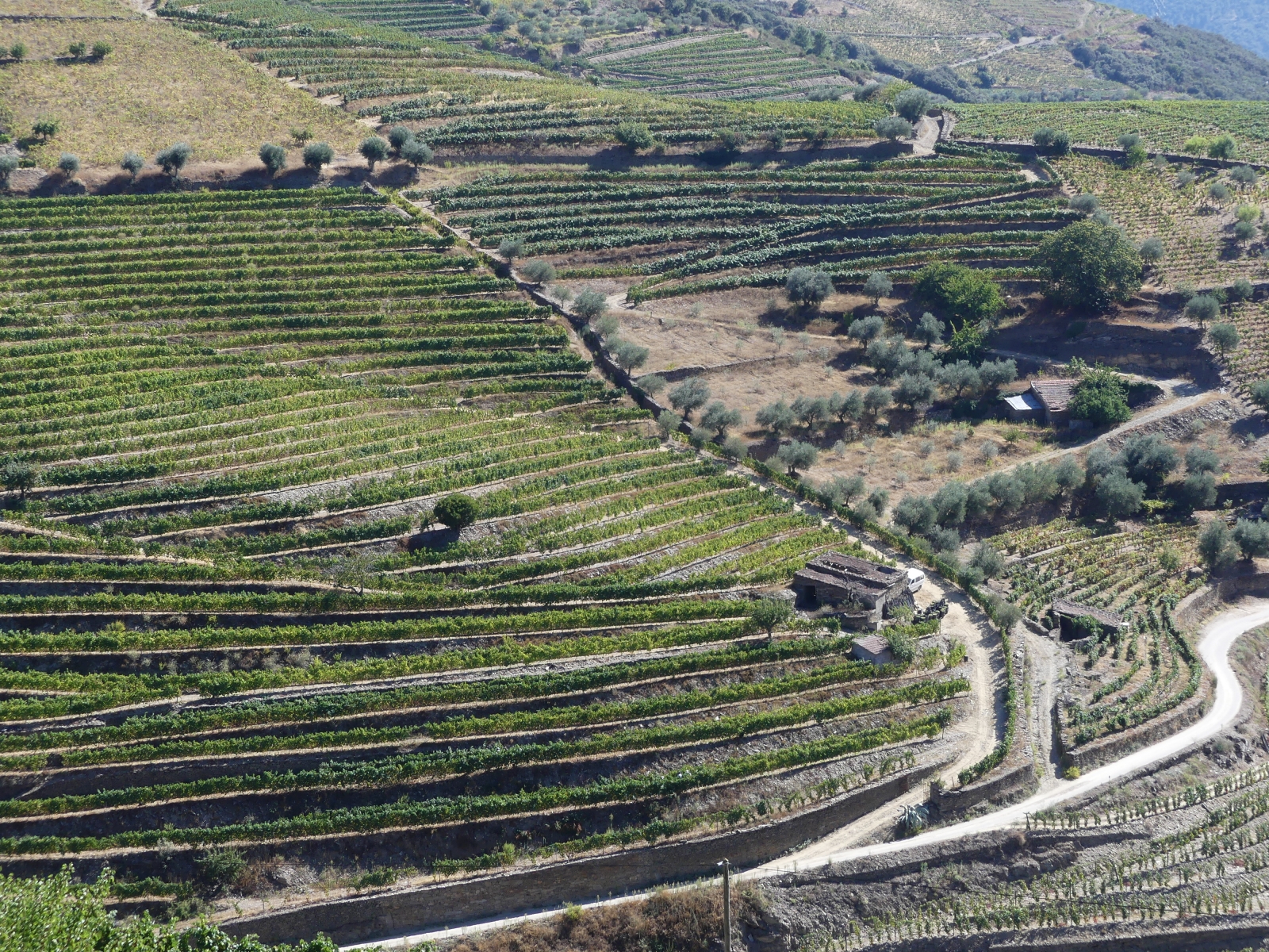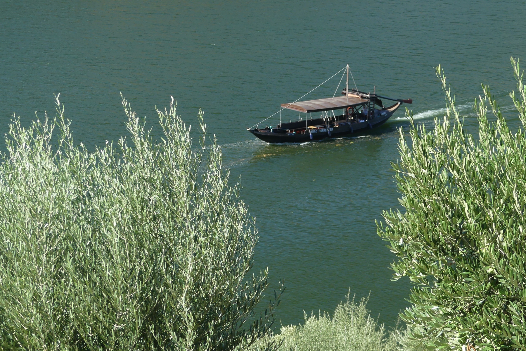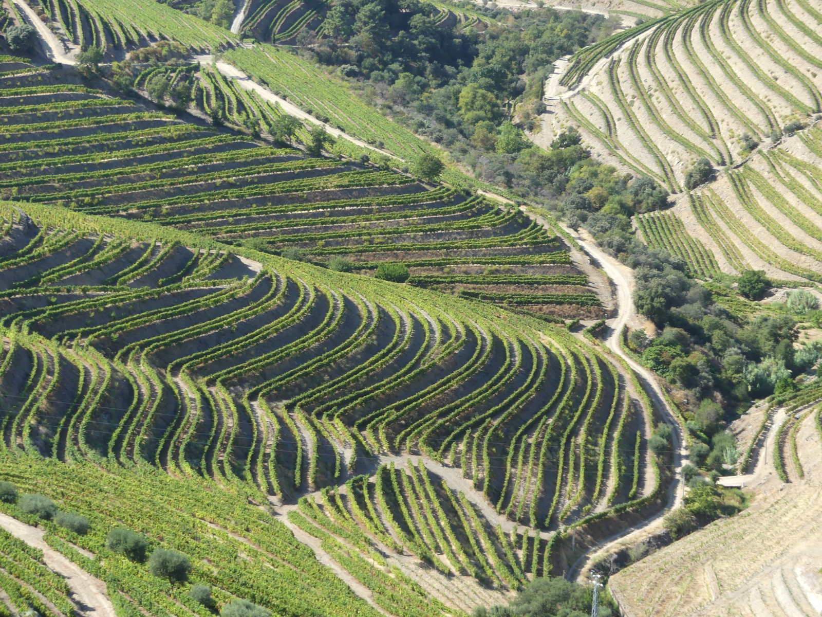 Par une petite route on traverse de très beaux paysages de vignes, de plantations d’oliviers et d’amandiers, avec des pigeonniers et de belles fermes. Plus on approche du Douro, plus cela devient grandiose: vignes en terrasses avec des formes circulaires ou mouvantes qui suivent les pentes du terrain. Le fleuve serpente au milieu des vignes avec ses beaux bateaux typiques.