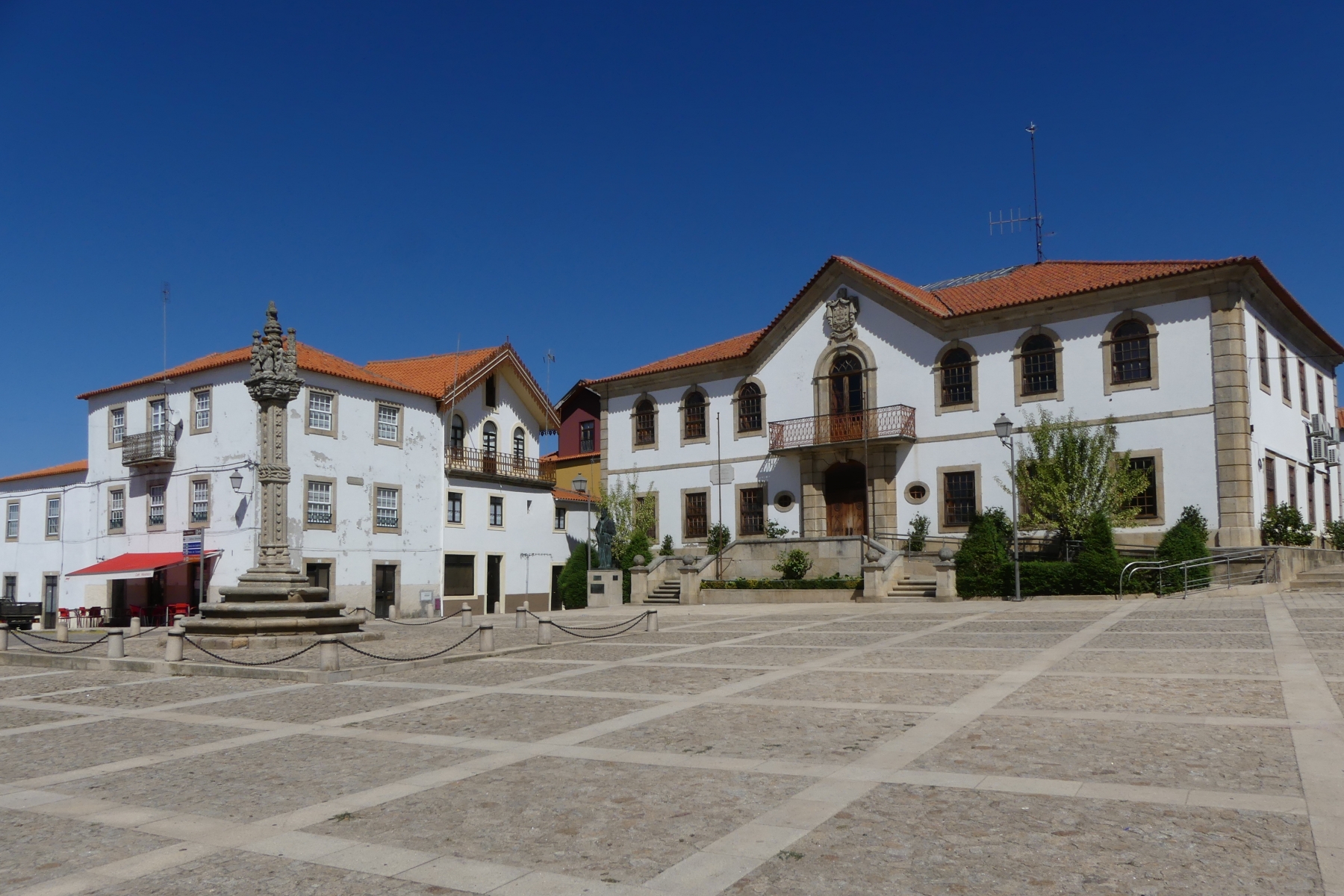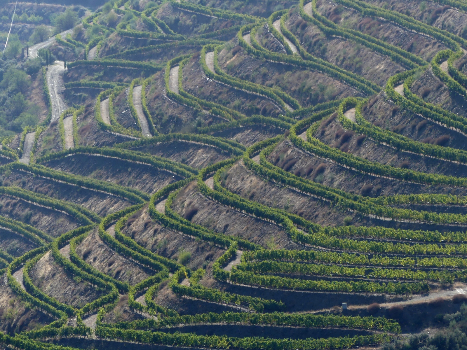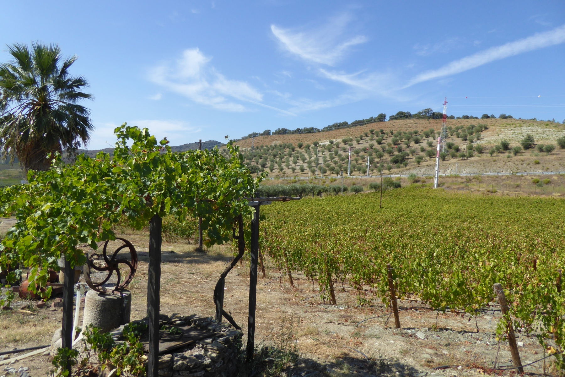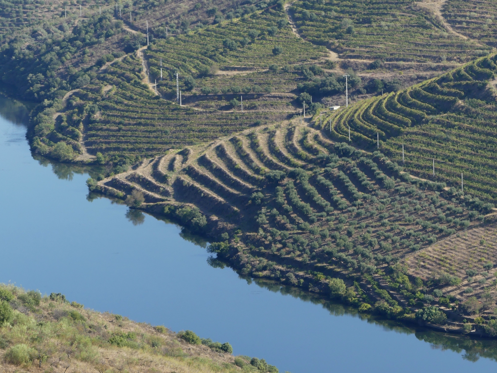 Par une petite route on traverse de très beaux paysages de vignes, de plantations d’oliviers et d’amandiers, avec des pigeonniers et de belles fermes. Plus on approche du Douro, plus cela devient grandiose: vignes en terrasses avec des formes circulaires ou mouvantes qui suivent les pentes du terrain. Le fleuve serpente au milieu des vignes avec ses beaux bateaux typiques.